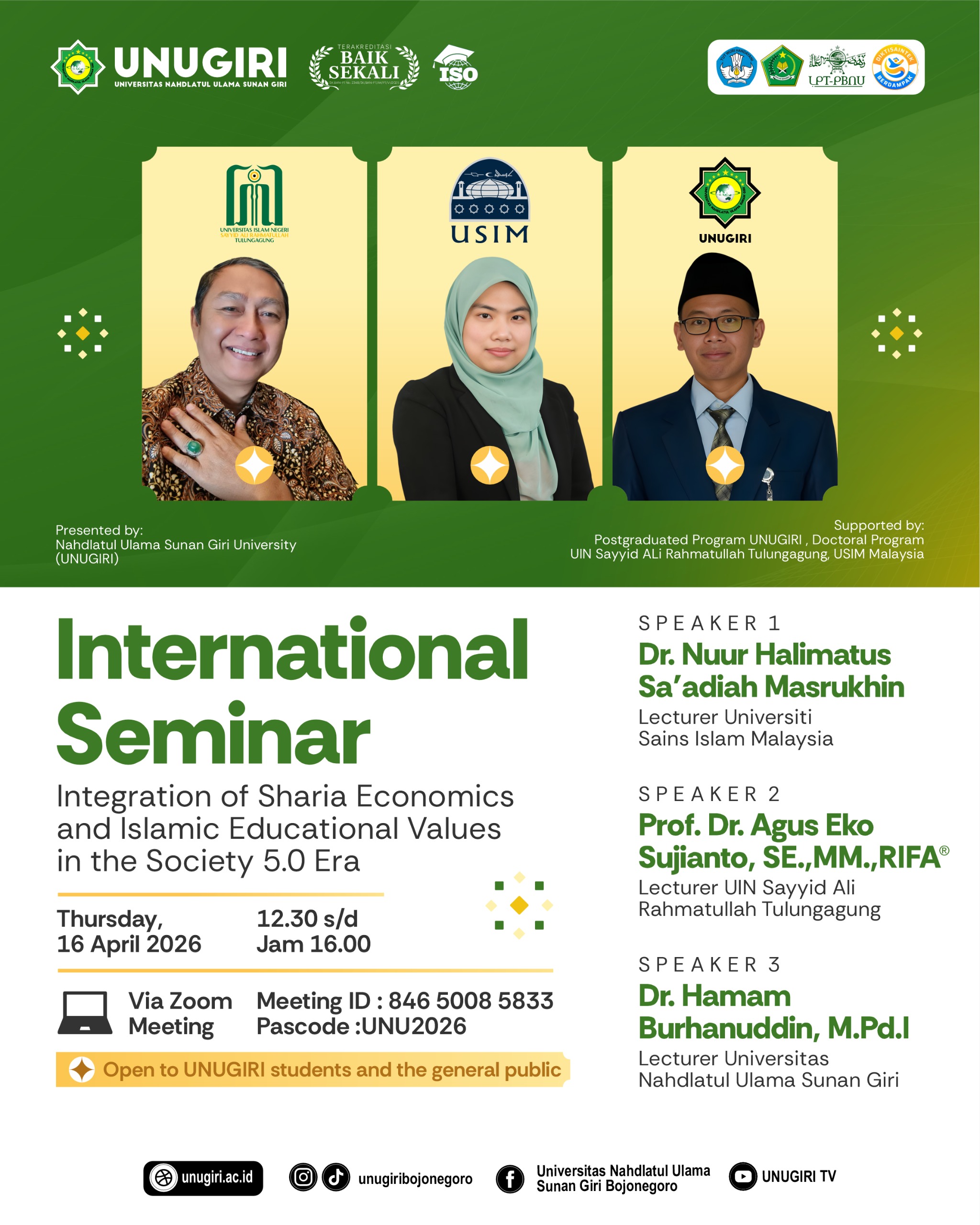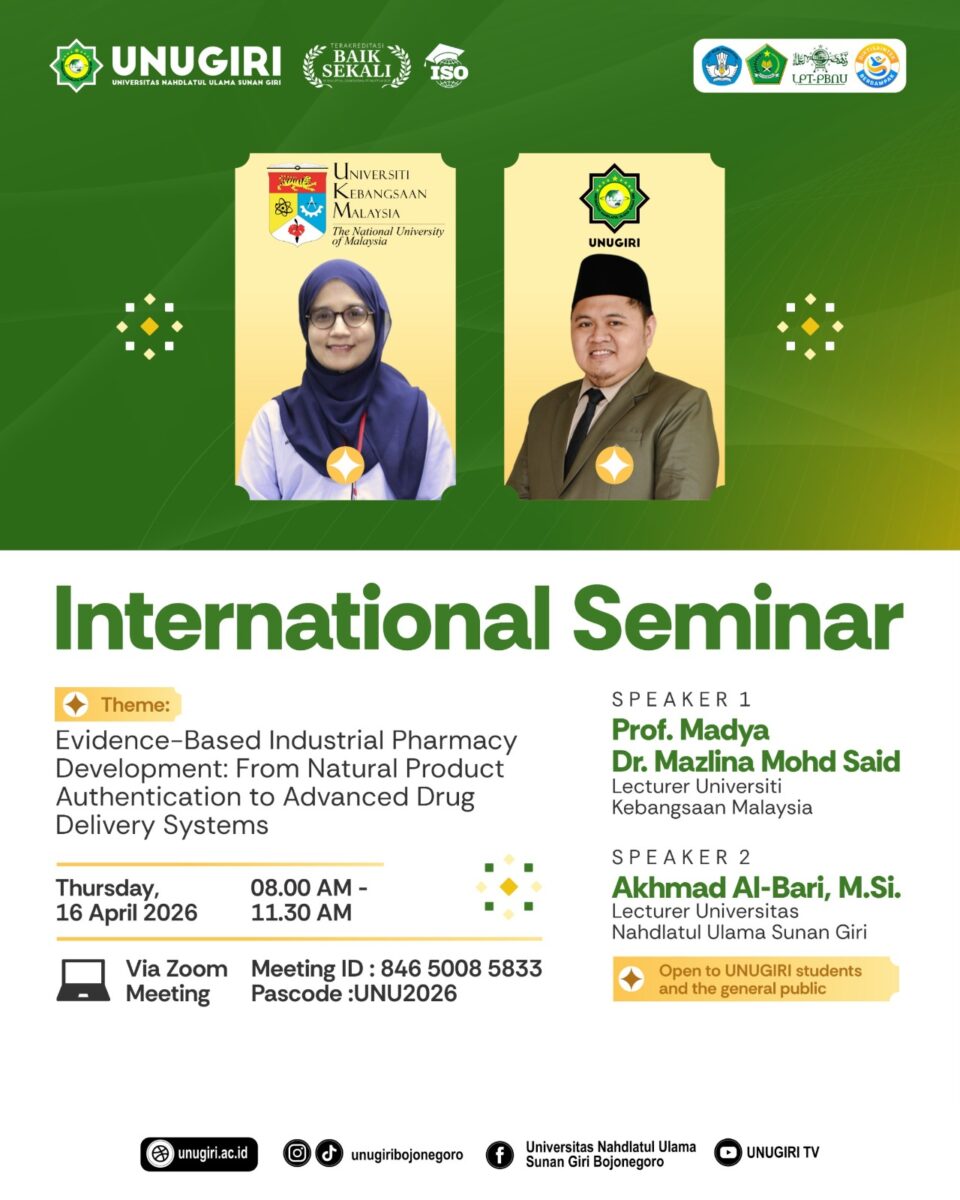 Bojonegoro — Program Pascasarjana Universitas Nahdlatul Ulama Sunan Giri (UNUGIRI) kembali menunjukkan kontribusi akademiknya di level internasional melalui keikutsertaan dosennya sebagai narasumber dalam kegiatan International Seminar yang dilaksanakan pada Kamis, 16 April 2026 secara daring melalui Zoom Meeting.